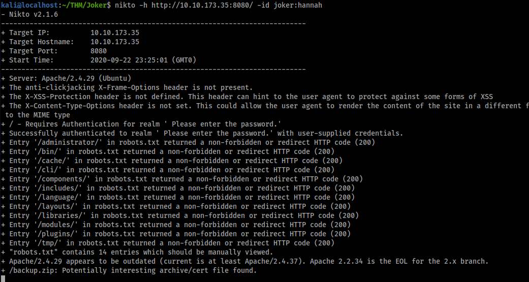 nikto -h http://10.10.173.35:8080/ -id joker:hannah