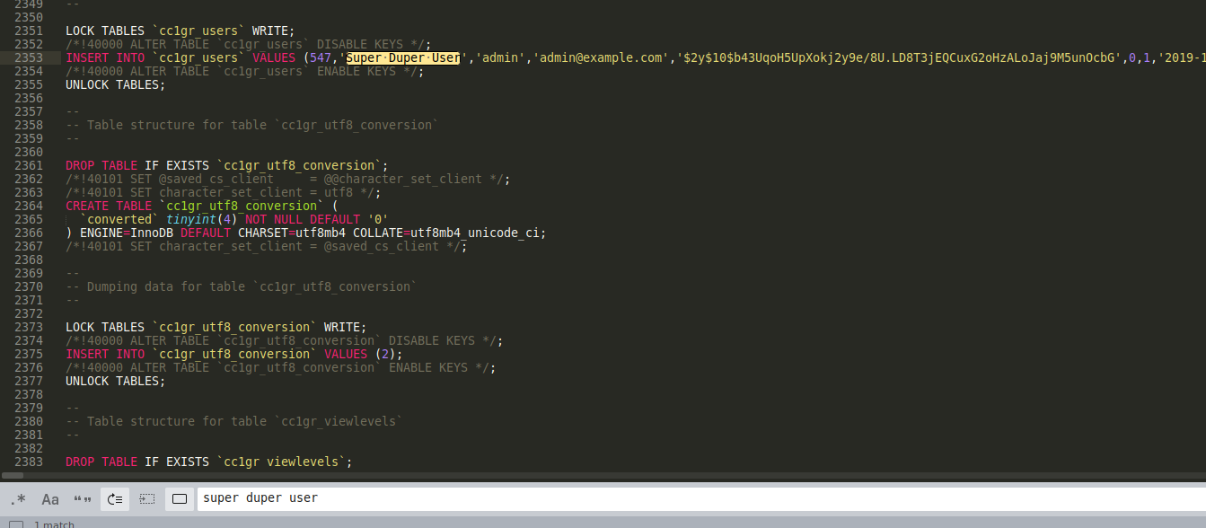Ok so we got access to this ‘Backup’ file now, lets enumerate. We are told to look for a “super duper user”, lets search for it in joombadb.sql!