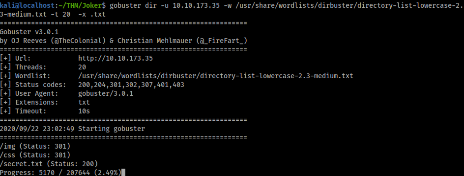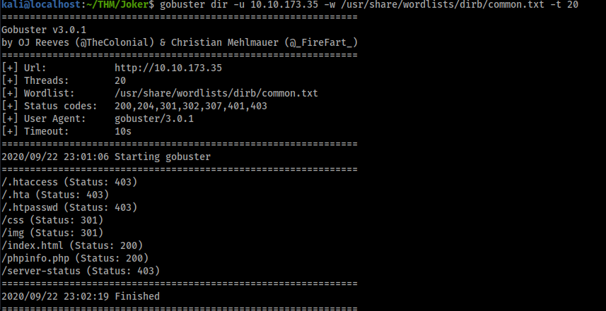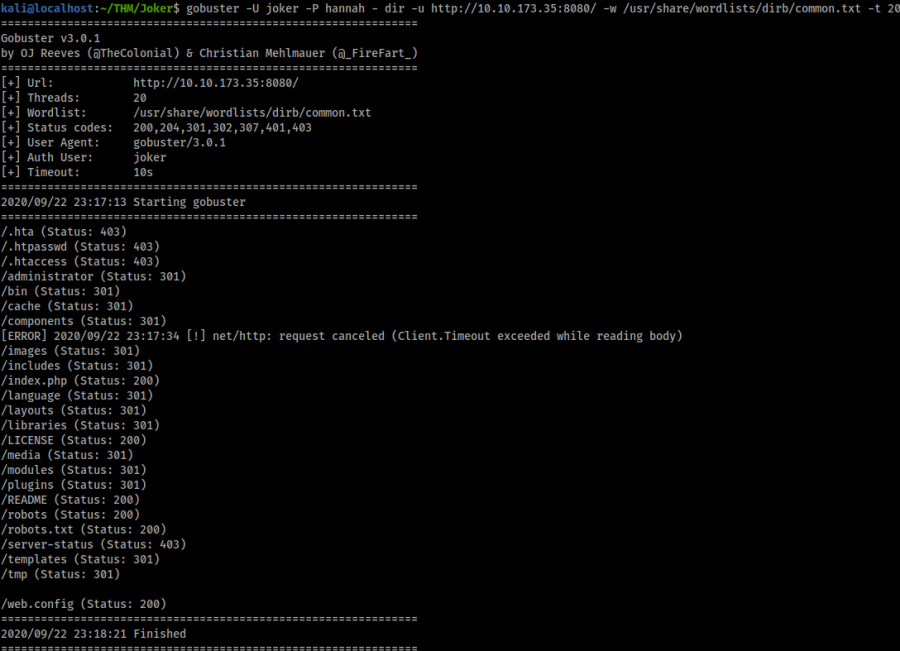 gobuster -U joker -P hannah - dir -u http://10.10.173.35:8080/ -w /usr/share/wordlists/dirb/common.txt -t 20